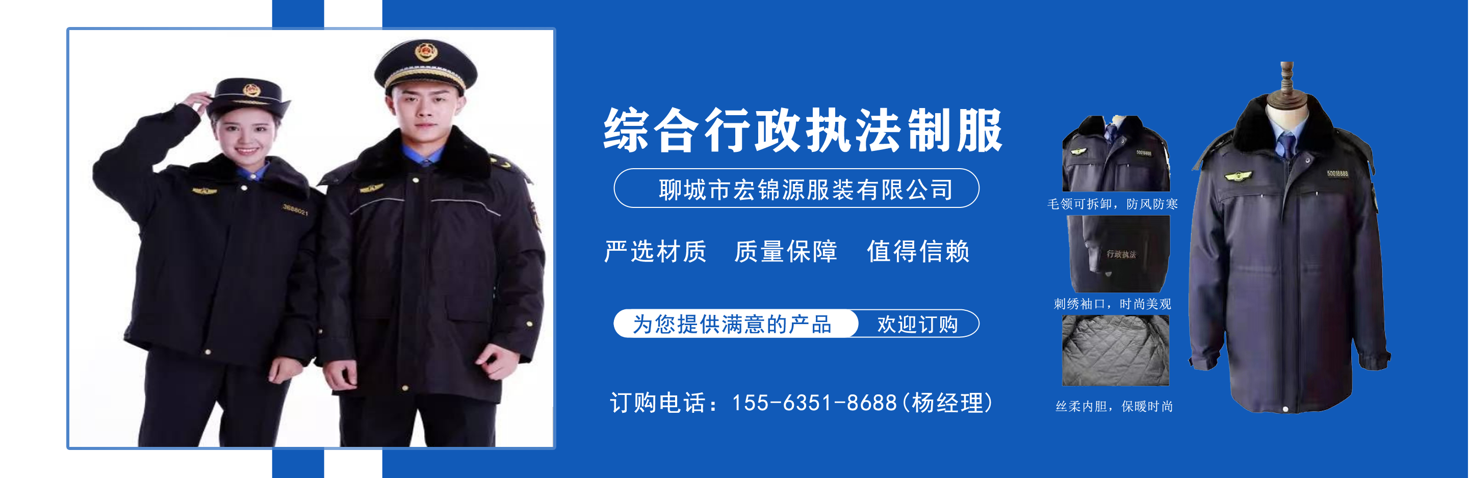 聊城市宏錦源服裝有限公司位于江北水城—山東聊城,地理位置優(yōu)越,交通便利。公司主營綜合行政執(zhí)法制服,交通執(zhí)法服裝,應(yīng)急管理執(zhí)法標(biāo)志服,市場監(jiān)督管理標(biāo)志服,農(nóng)業(yè)執(zhí)法服裝,生態(tài)環(huán)境保護制服,文化市場執(zhí)法服,城管標(biāo)志服裝廠,衛(wèi)生監(jiān)督制服,六部門標(biāo)志服廠家等,值得信賴! 公司生產(chǎn)的標(biāo)志服裝據(jù)有造型美、板型新、多次水洗不退色、不變型、不起泡?! 罢J真辦事,踏實做人”是宏錦源的企業(yè)精神,我們的宗旨是:“用服務(wù)與真誠來換取你的信任與支持,互惠互利,共創(chuàng)雙贏!”我公司愿與國內(nèi)外各界同仁志士竭誠合作,共創(chuàng)未來企業(yè)目標(biāo):在已選定的服飾領(lǐng)域中,成為行業(yè)的卓越者。 經(jīng)營理念:追求產(chǎn)品卓越,為用戶提供完美、高效的服務(wù)。...